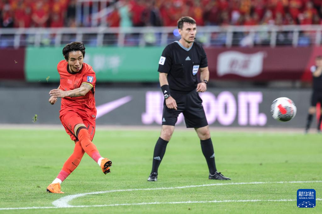 6月6日,中国队球员韦世豪在比赛中射门。新华社记者 张晨 摄