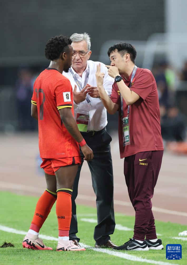 6月6日,中国队主教练伊万科维奇(中)在比赛中指导球员费南多(左)。新华社记者 曹灿 摄