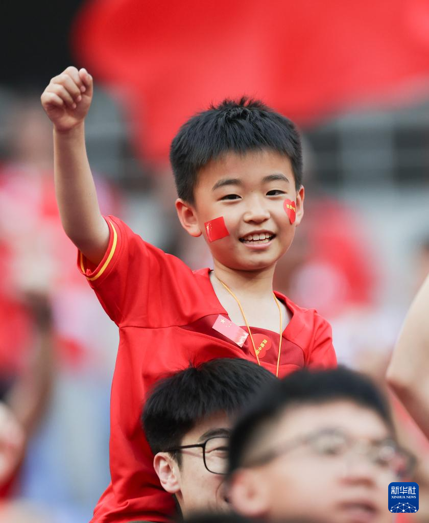 6月6日,一位小球迷在赛前为中国队助威。新华社记者 李钢 摄