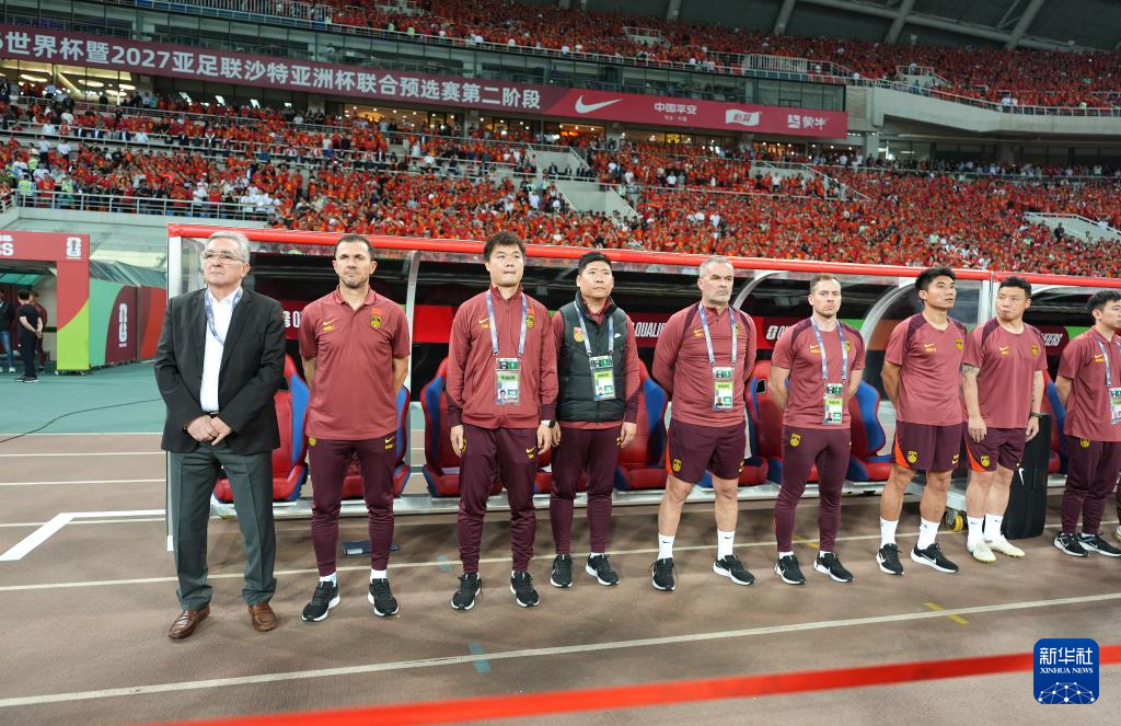 6月6日,中国队主教练伊万科维奇(左一)与教练团队在比赛前的奏唱国歌仪式上。新华社记者 李钢 摄