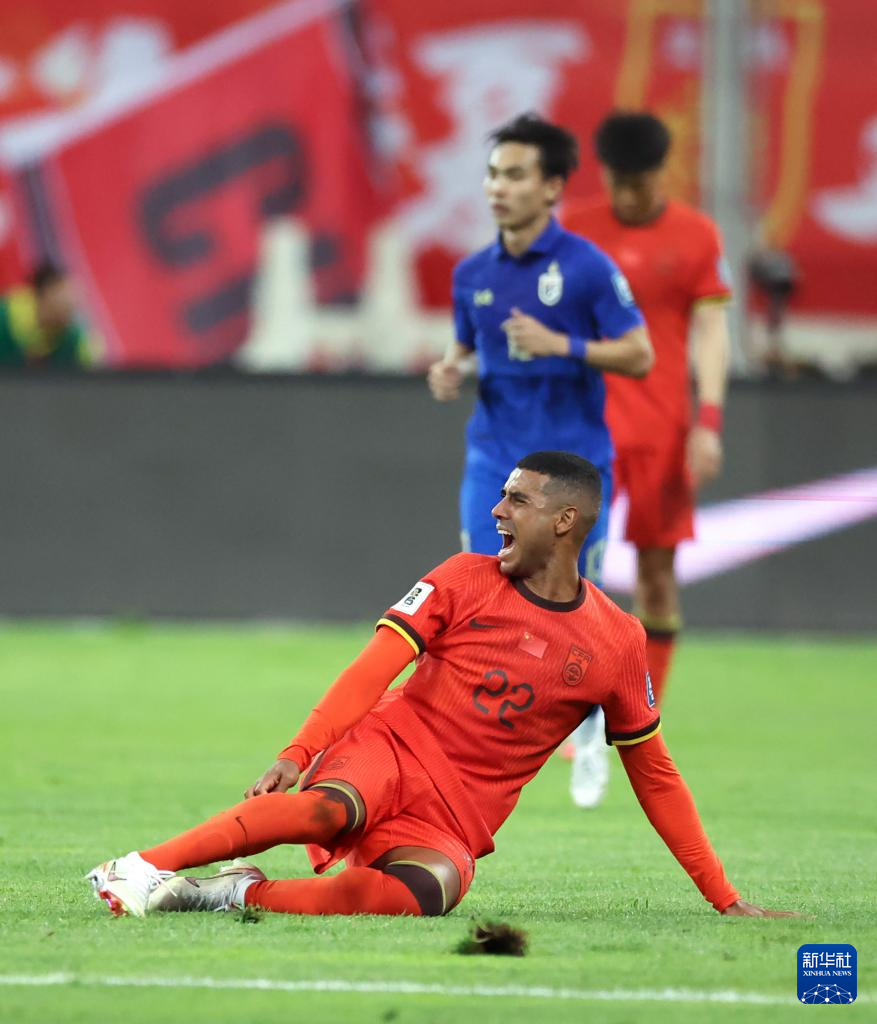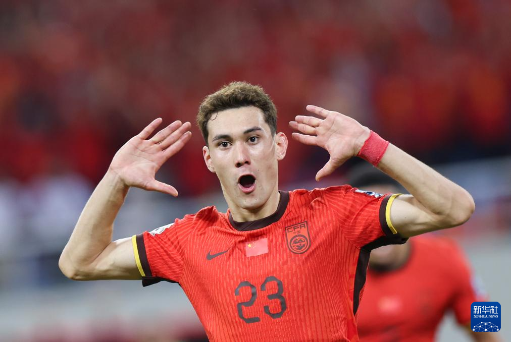 6月6日,首次代表国家队出场的中国队球员拜合拉木·阿卜杜外力在进球后庆祝。新华社记者 李钢 摄