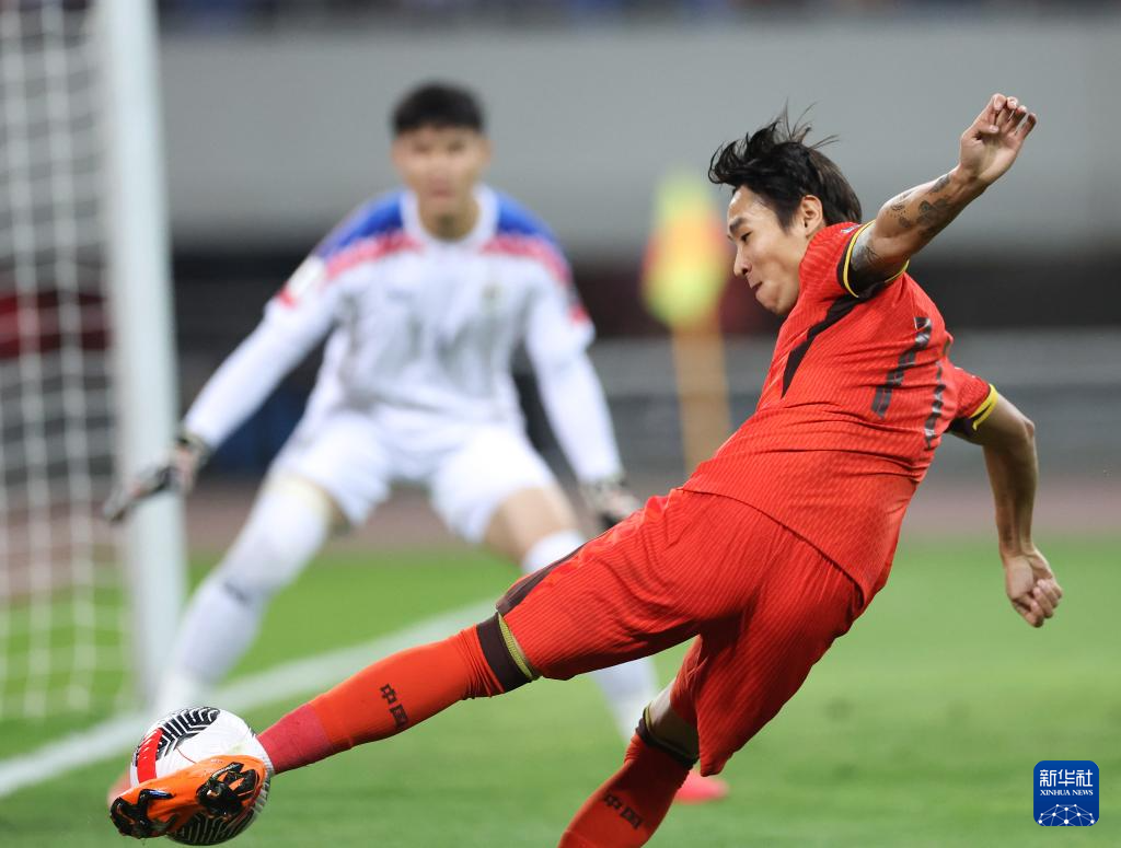 6月6日,首次代表国家队出场的中国队球员拜合拉木·阿卜杜外力(右三)在比赛中射门得分。新华社记者 李钢 摄