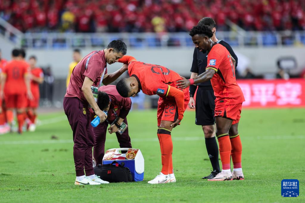 6月6日,中国队球员阿兰(中)在比赛中接受治疗。新华社记者 潘昱龙 摄