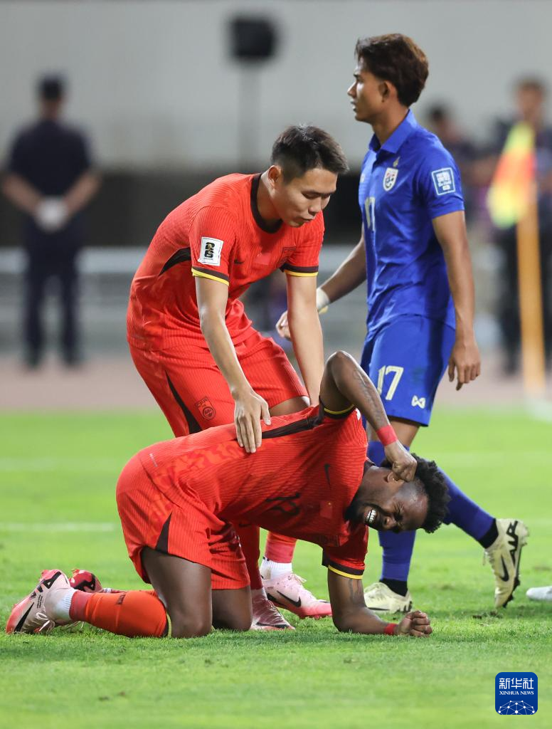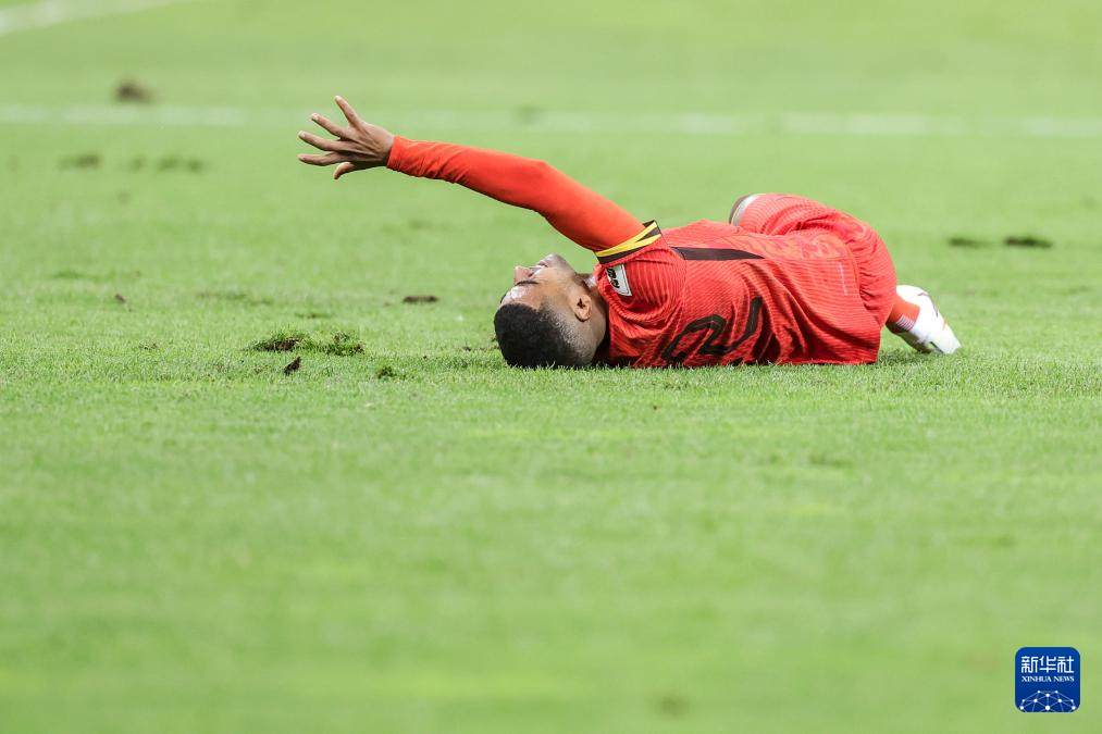 6月6日,中国队球员阿兰在比赛中倒地。新华社记者 潘昱龙 摄
