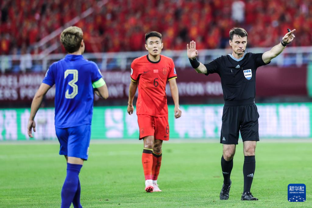 6月6日,主裁判坦塔舍夫(右)向泰国队球员提拉通(左)示意。新华社记者 潘昱龙 摄