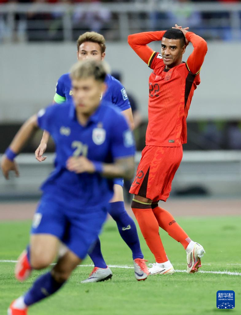 6月6日,首次代表国家队出场的中国队球员拜合拉木·阿卜杜外力(右)在比赛中与泰国队球员素巴楚(左)拼抢。新华社记者 曹灿 摄