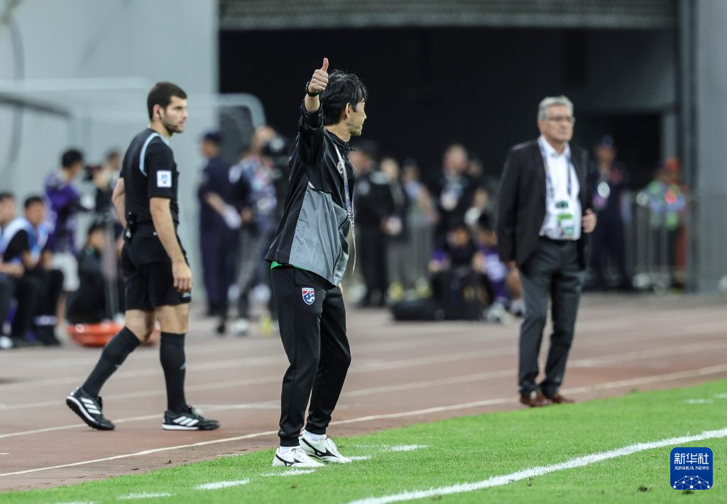 6月6日,泰国队主教练石井正忠(中)在比赛中向球员示意。新华社记者 潘昱龙 摄
