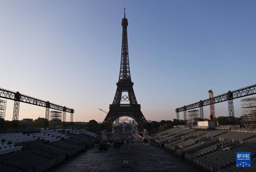 这是6月7日清晨在法国巴黎拍摄的悬挂奥运五环标志的埃菲尔铁塔以及正在搭建看台的特罗卡德罗广场,巴黎奥运会开幕式的庆祝活动将在这里举行。新华社记者 高静 摄