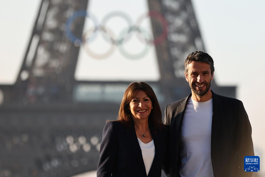 6月7日, 巴黎奥组委主席托尼·埃斯坦盖(右)和巴黎市长伊达尔戈与悬挂奥运五环标志的埃菲尔铁塔合影留念。新华社记者 高静 摄