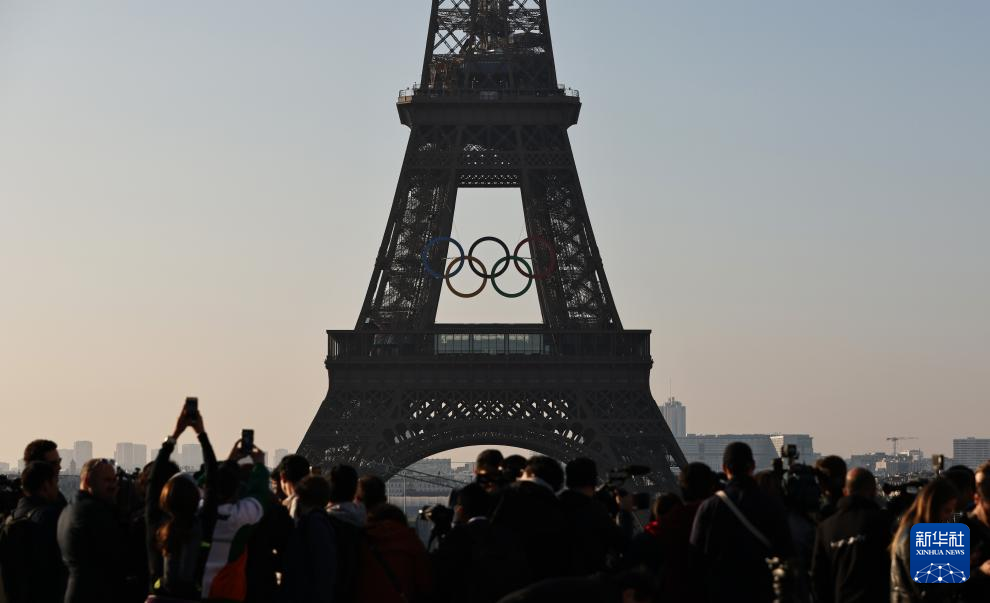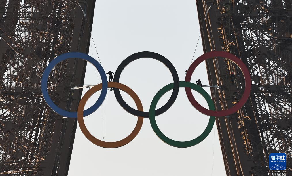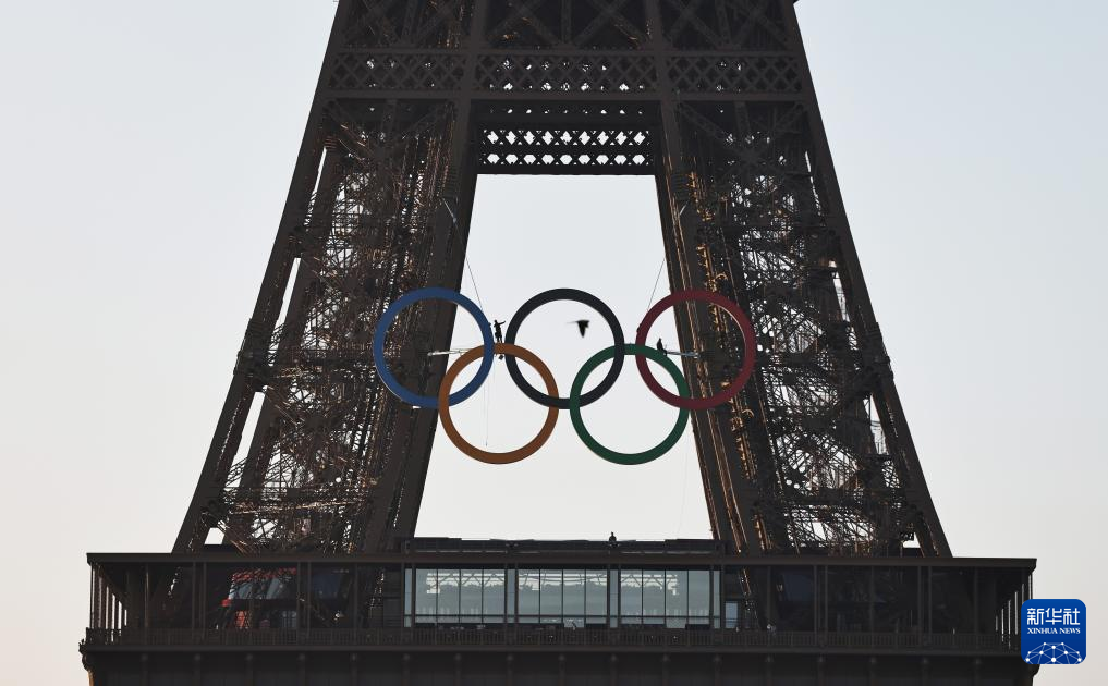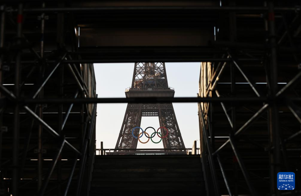 巴黎奥运会开幕倒计时50天之际,奥运五环标志于7日清晨亮相埃菲尔铁塔。巴黎奥运会将于7月26日至8月11日举行。