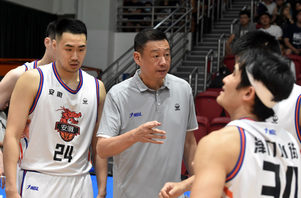 图为2023年9月3日,安徽文一队主教练郑武(中)在2023年全国男子篮球联赛(NBL)季后赛中指导球员。新华社记者 卢炳辉 摄