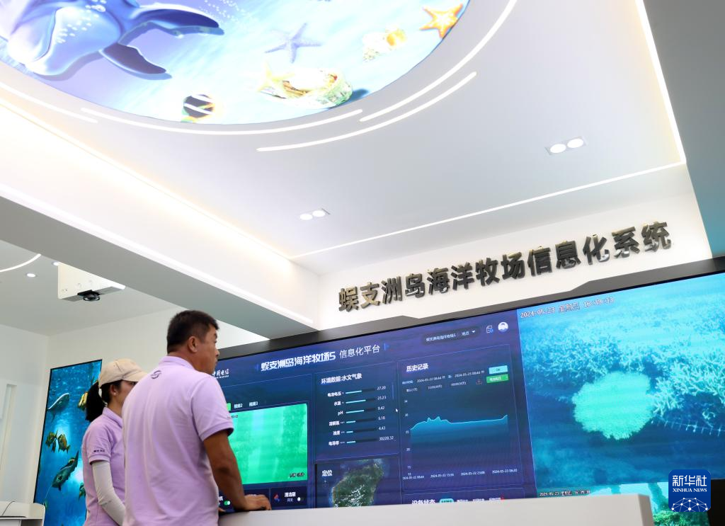 在三亚蜈支洲岛,王丰国(右)查看海洋牧场信息化系统(2024年5月23日摄)。新华社记者 杨冠宇 摄