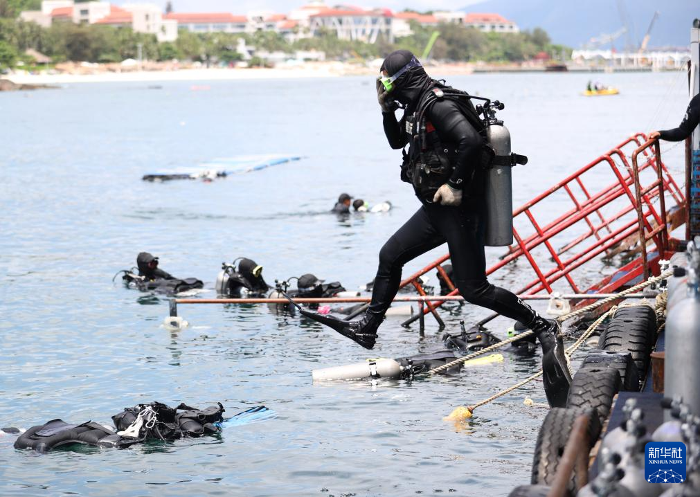 王丰国背着气瓶跳入海中(2024年5月23日摄)。新华社记者 张晨 摄