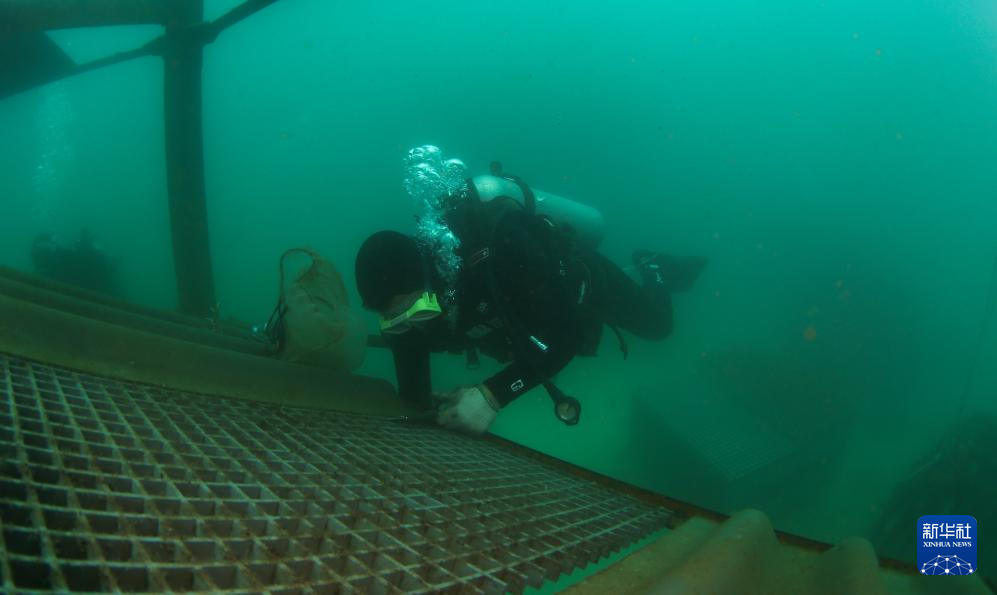 在三亚蜈支洲岛海域海洋牧场,王丰国在安装人工鱼礁(2024年5月23日摄)。新华社记者 杨冠宇 摄
