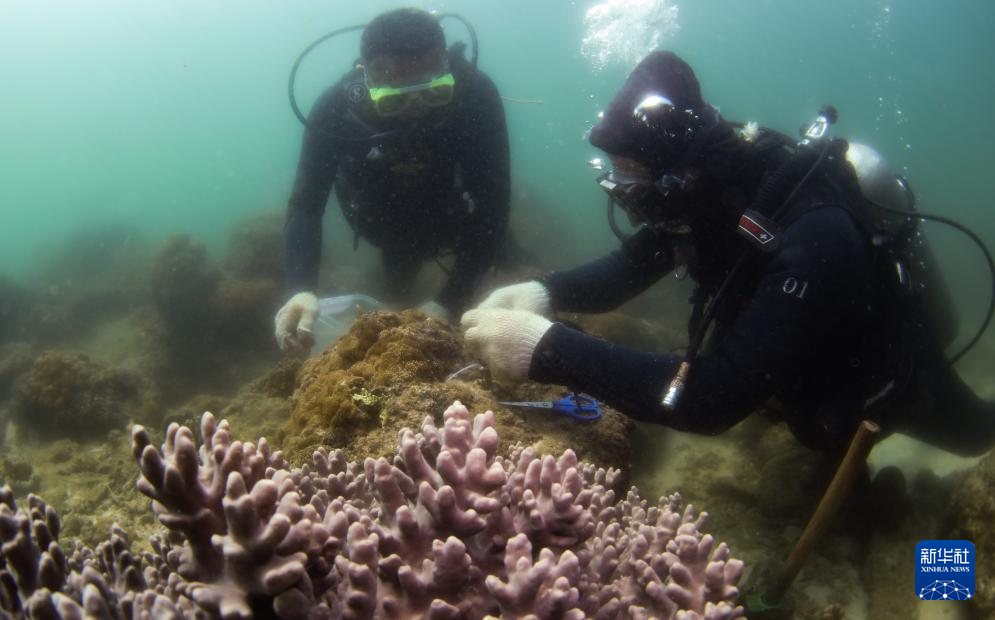 在三亚蜈支洲岛海域海洋牧场,王丰国(右)和同事在移植珊瑚(2023年5月17日摄)。新华社记者 杨冠宇 摄