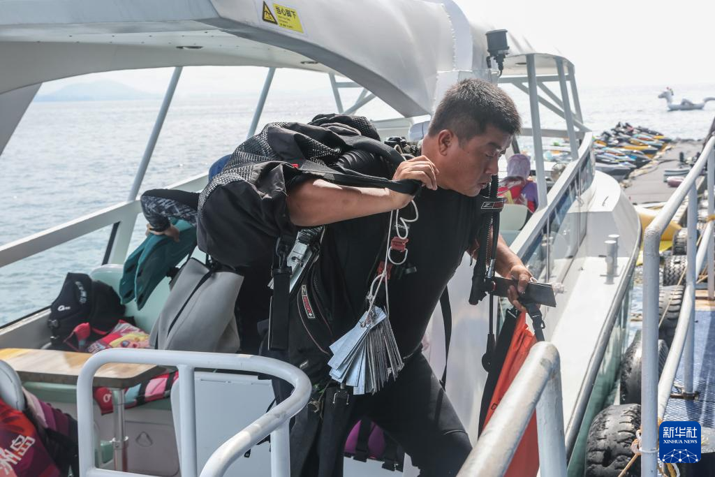 王丰国带着潜水设备登上潜水平台,准备下海(2024年5月23日摄)。新华社记者 张丽芸 摄