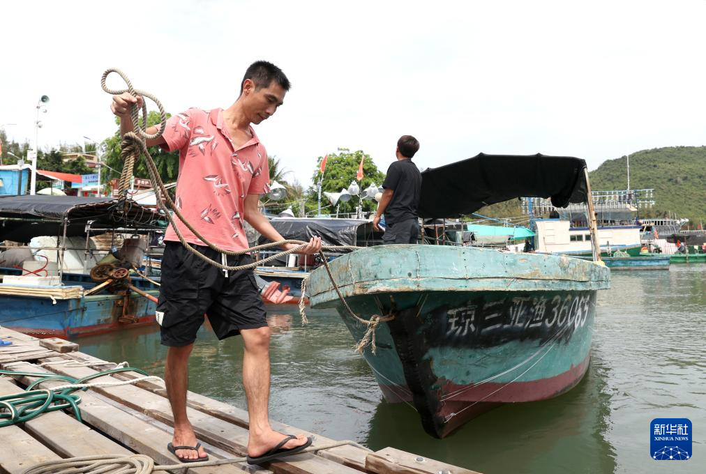 在后海村的码头上,杨兴富牵着缆绳帮同村渔民的渔船停泊靠岸(2024年5月21日摄)。新华社记者 张晨 摄