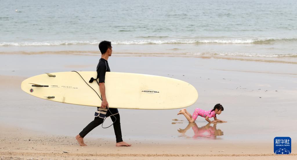 杨兴富手提冲浪板行走在后海村皇后湾的沙滩上,他的女儿佳佳在一旁玩耍(2024年5月21日摄)。新华社记者 张晨 摄