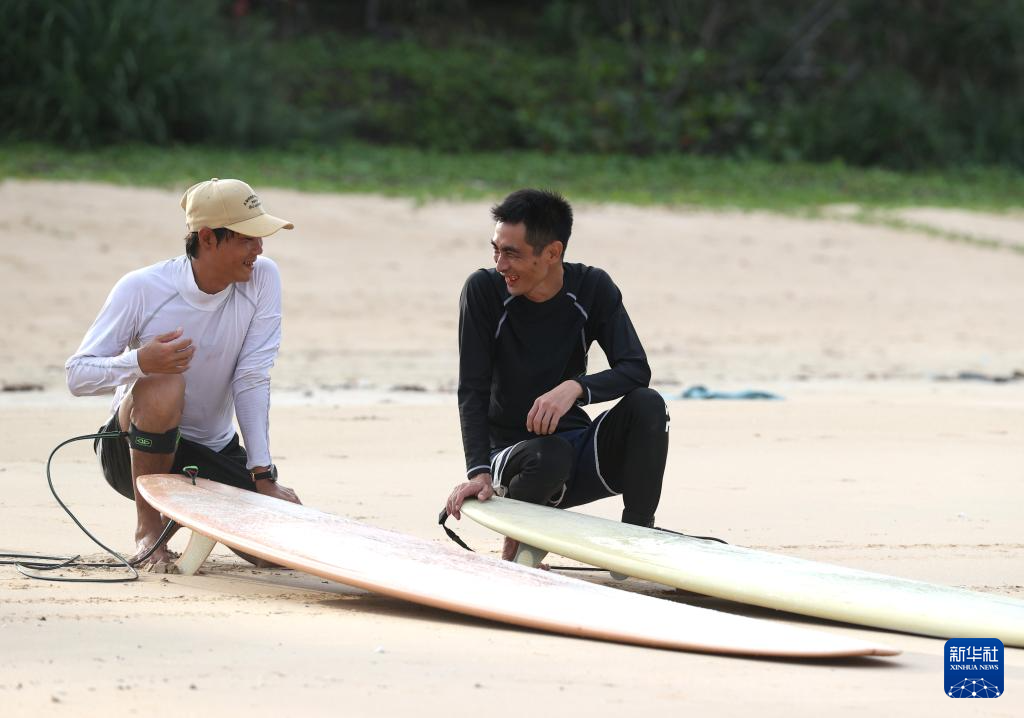 在后海村皇后湾的沙滩上,杨兴富(右)下水前与另一名冲浪者交流(2024年5月21日摄)。新华社记者 张晨 摄