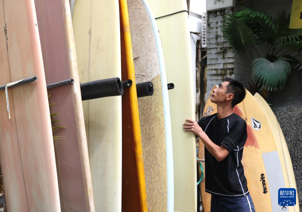 在后海村一家冲浪俱乐部外,杨兴富取下冲浪板准备去冲浪(2024年5月21日摄)。新华社记者 张晨 摄