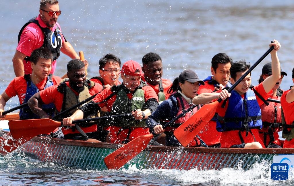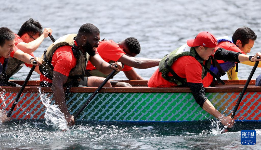 6月8日,代表英超曼彻斯特城队参加“全英中华端午龙舟会”的选手在比赛中。新华社记者 李颖 摄