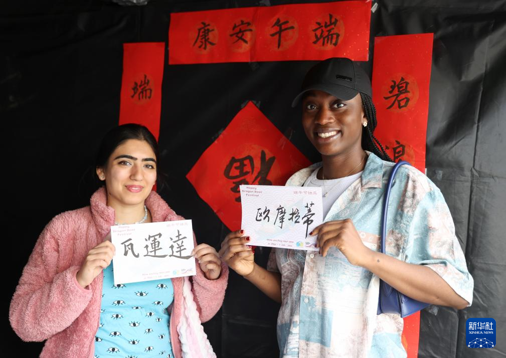 6月8日,两名女子在“全英中华端午龙舟会”上展示自己的中文名字。新华社记者 李颖 摄