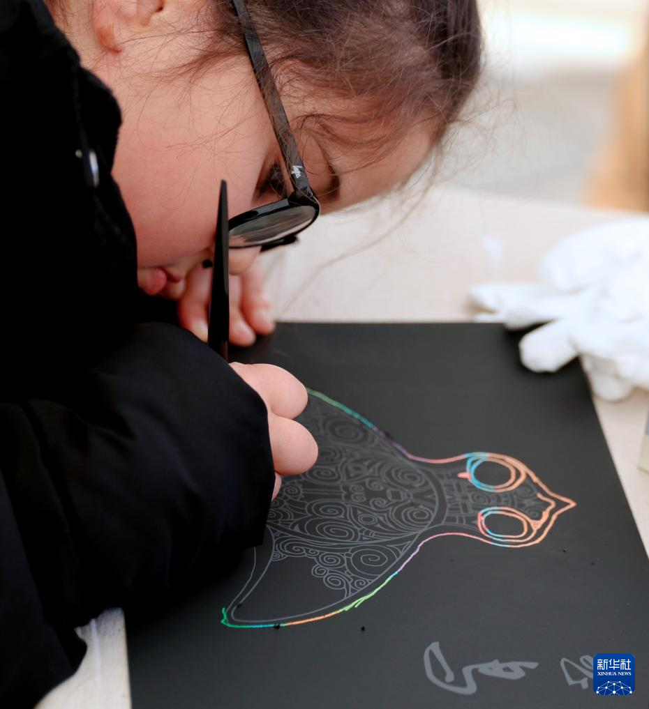 6月8日,一名女孩在“全英中华端午龙舟会”上描画良渚玉器纹饰的飞鸟图。新华社记者 李颖 摄