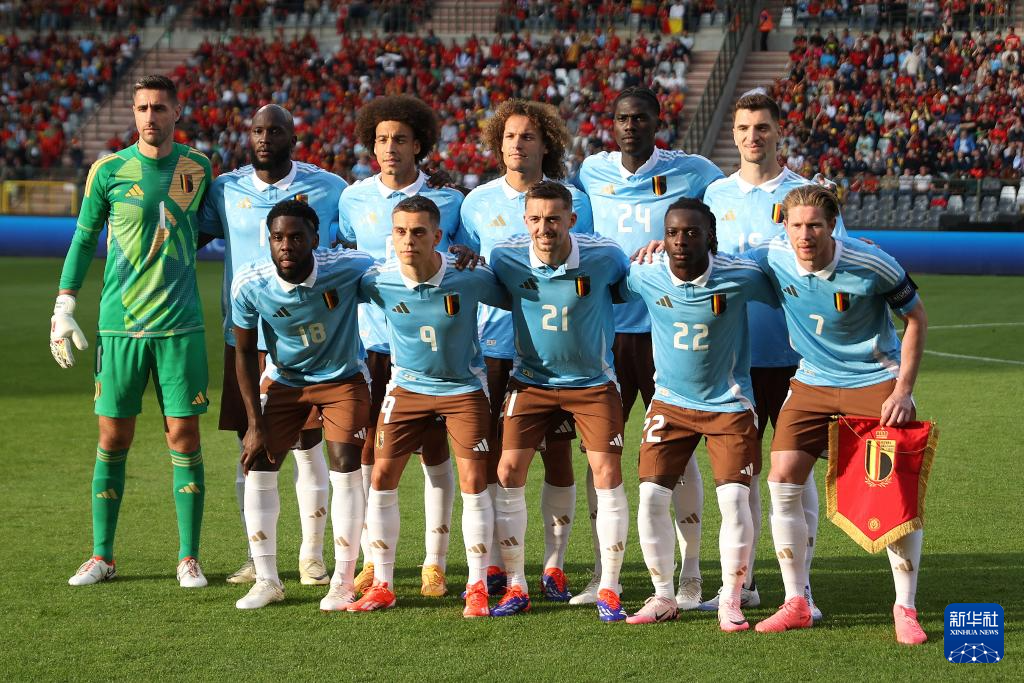 6月8日,比利时队首发球员在比赛前合影。新华社记者 赵丁喆 摄