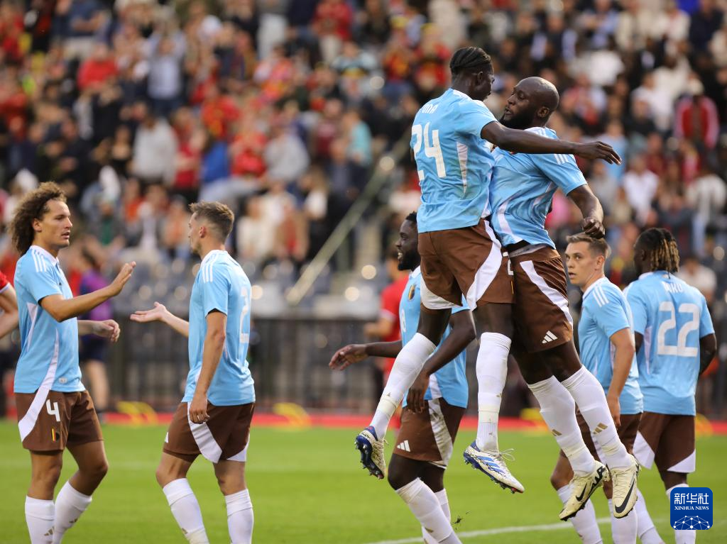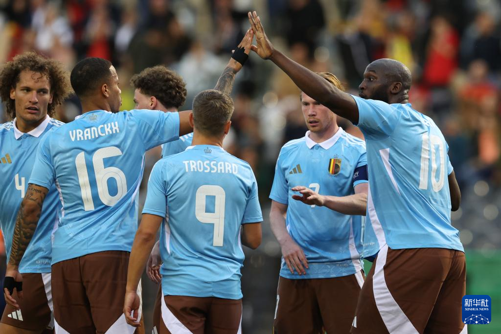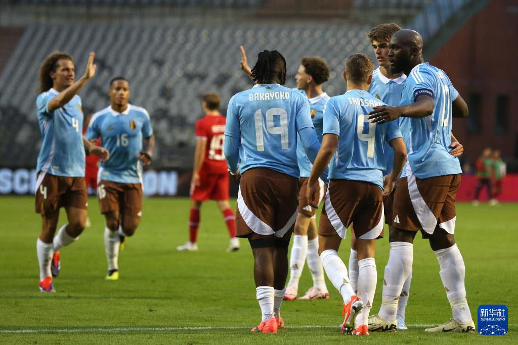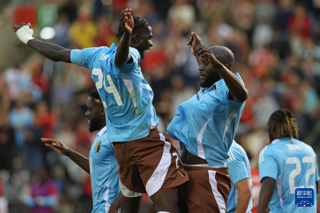 6月8日,比利时队球员在进球后庆祝。新华社发(刘子赫 摄)