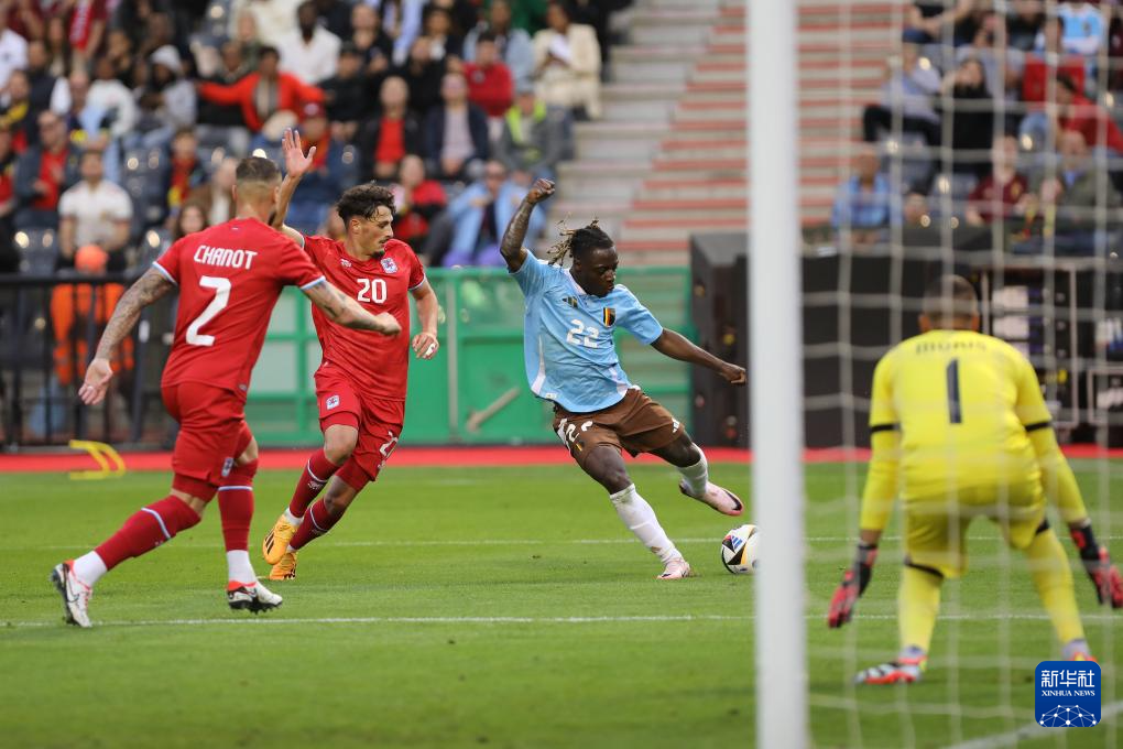 6月8日,比利时队球员多库(右二)在比赛中进攻。新华社发(刘子赫 摄)