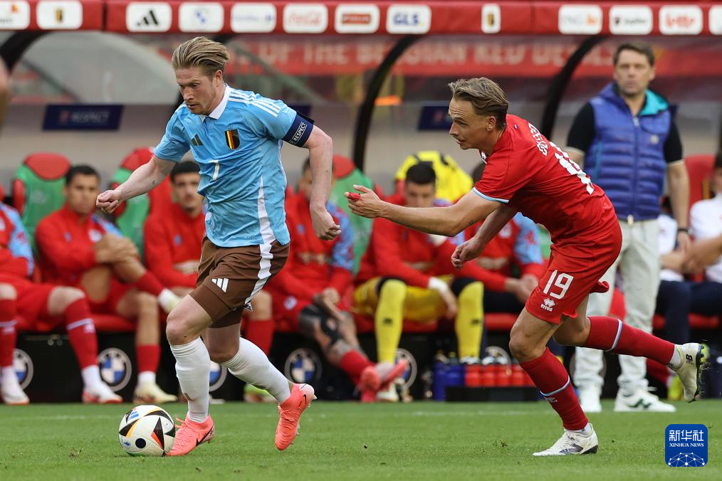 6月8日,比利时队球员德布劳内(左)在比赛中进攻。新华社记者 赵丁喆 摄