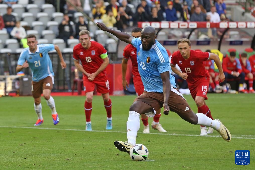 6月8日,比利时队球员卢卡库(前)在比赛中主罚点球得分。新华社记者 赵丁喆 摄
