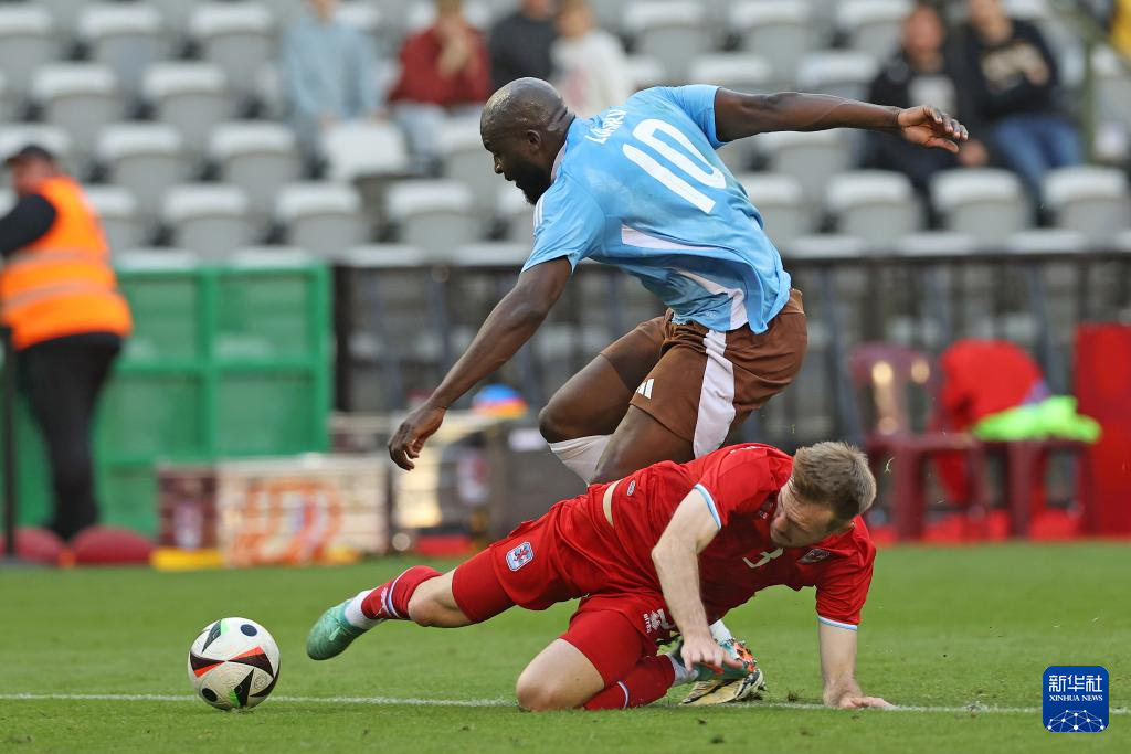 6月8日,比利时队球员多库(右)在比赛中拼抢。新华社记者 赵丁喆 摄
