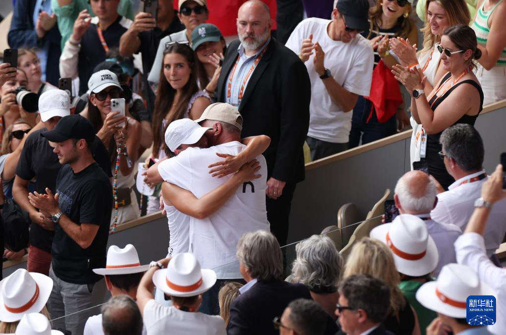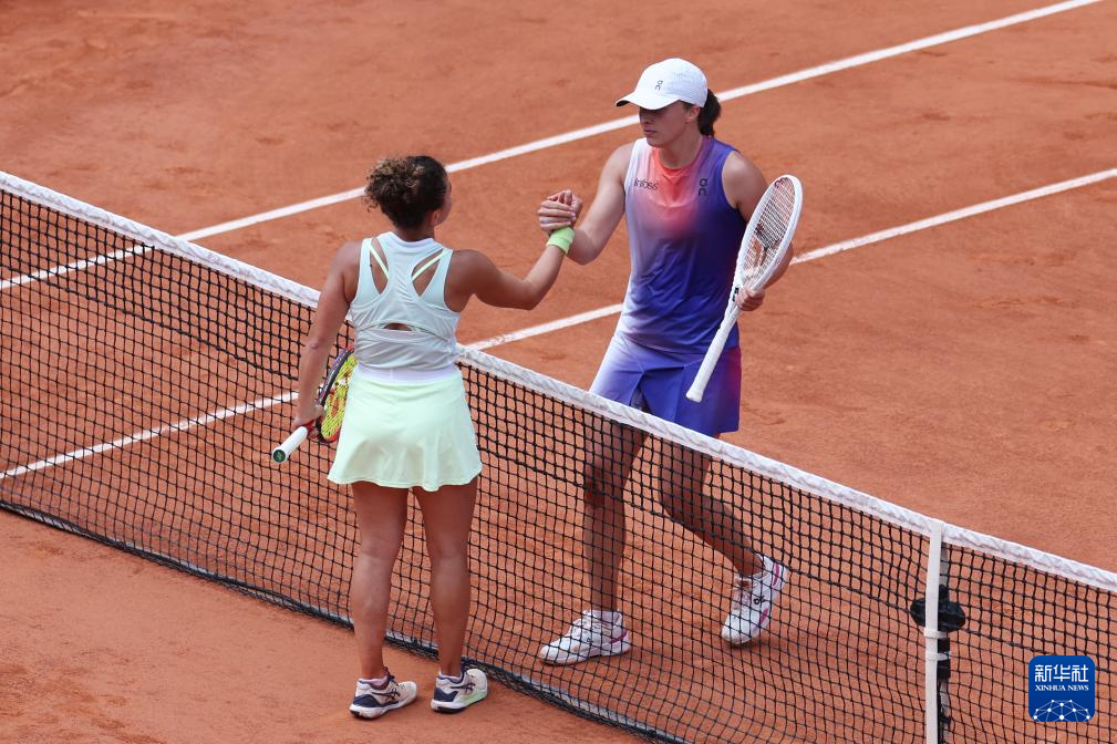 6月8日,斯维亚特克(右)赛后向保利尼致意。新华社记者 高静 摄