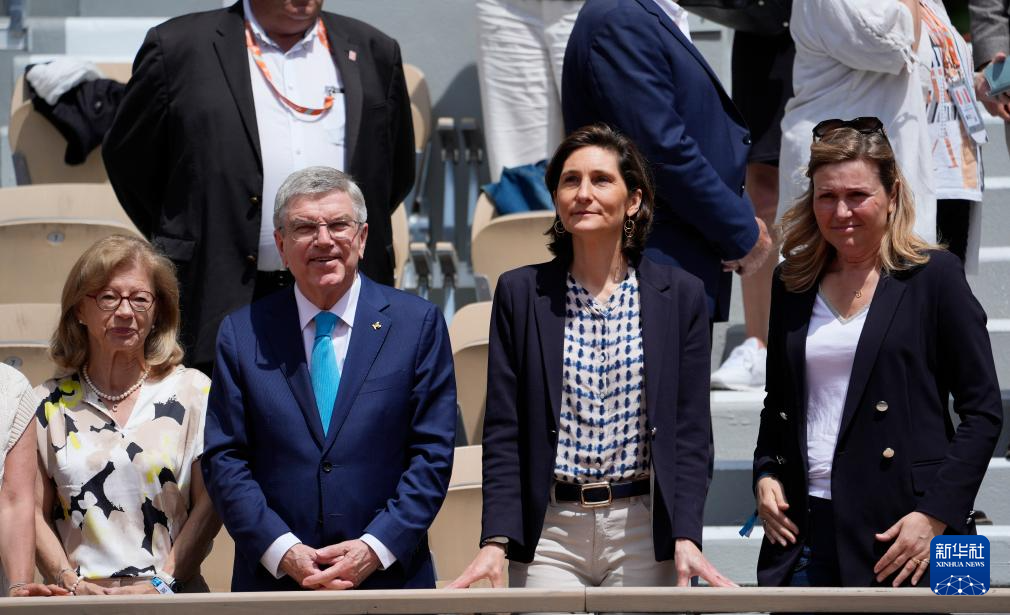 6月8日,国际奥委会主席巴赫(左二)和法国体育部长卡斯特拉(右二)在看台上。新华社记者 高静 摄