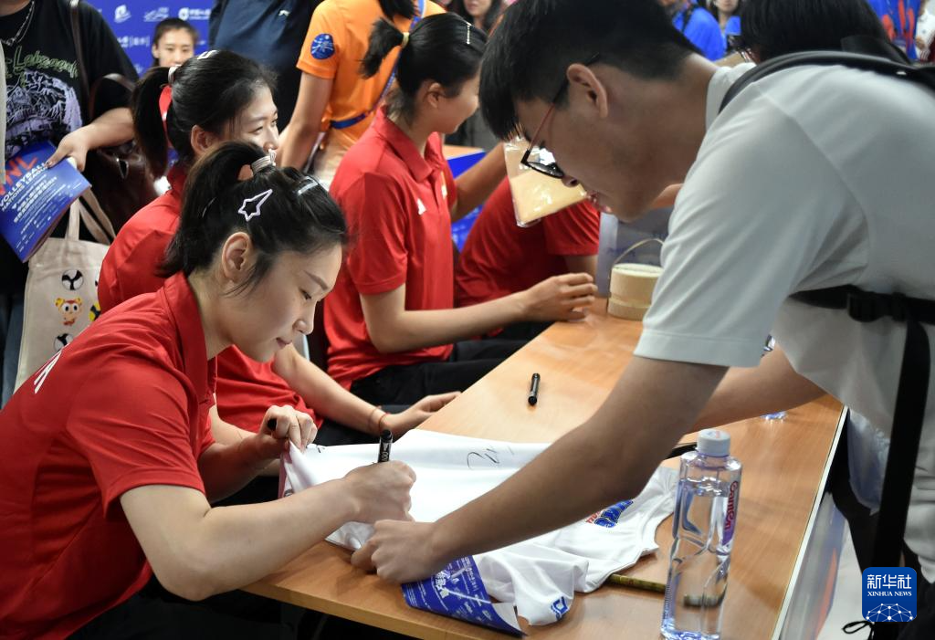 6月8日,中国队球员王梦洁(左一)为球迷签名。新华社记者 卢炳辉 摄