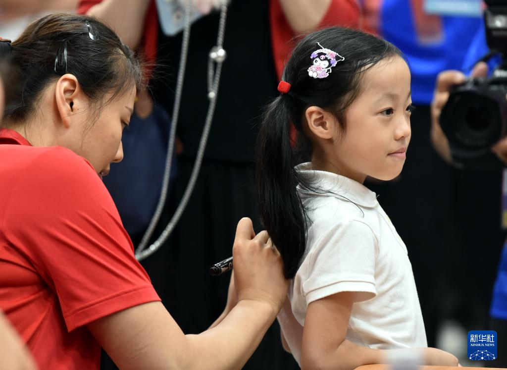 6月8日,中国队球员袁心玥(左一)为球迷签名。新华社记者 卢炳辉 摄