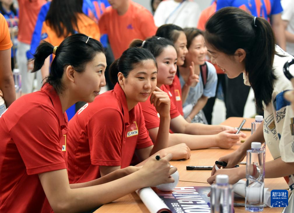 当日,中国女排队员在香港体育馆训练后为球迷签名。中国女排将于6月11日至16日参加世界女排联赛香港站比赛。
