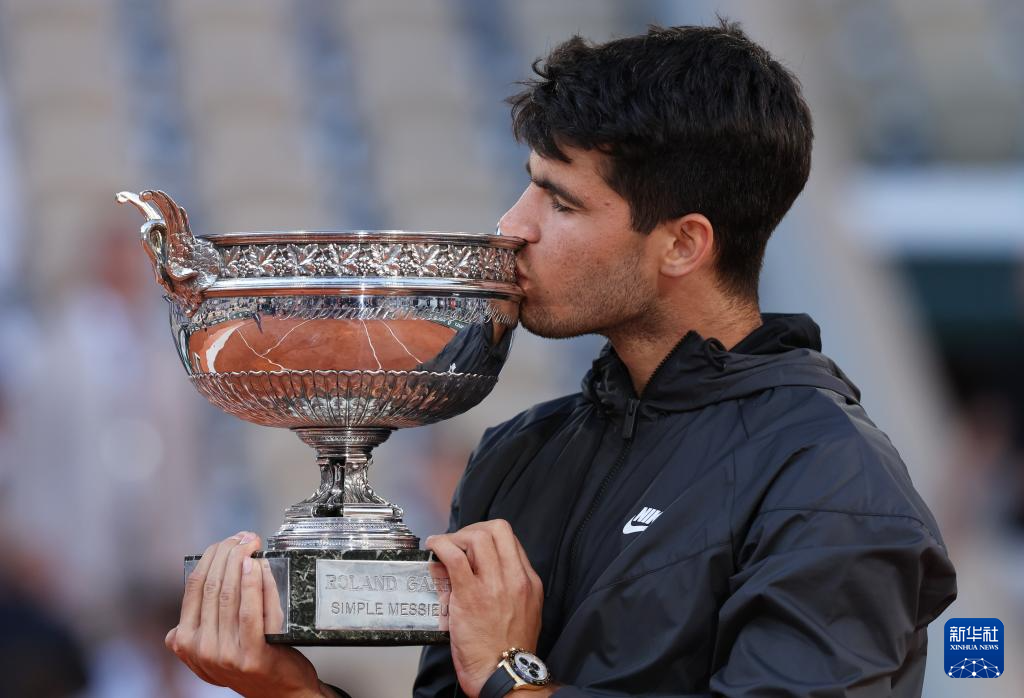 6月9日,阿尔卡拉斯亲吻冠军奖杯。新华社记者 高静 摄