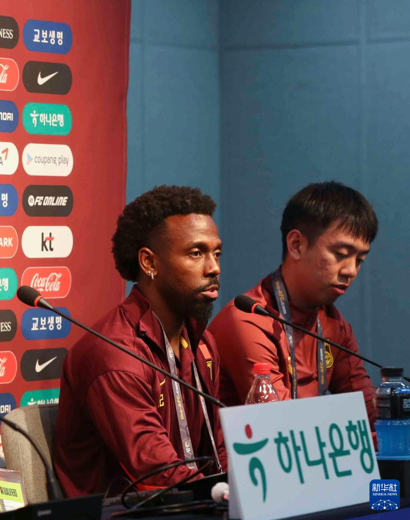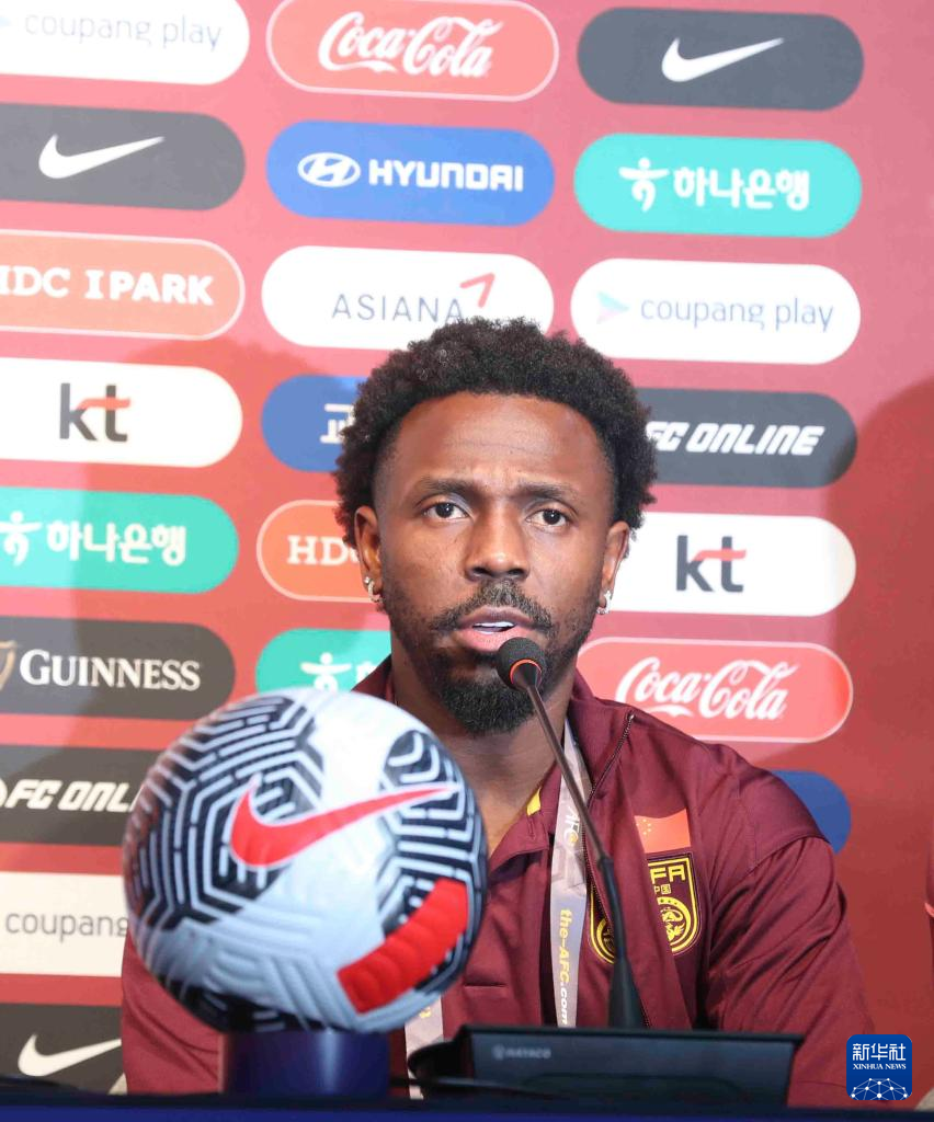 6月10日,中国队球员费南多在发布会上回答提问。新华社记者 姚琪琳 摄