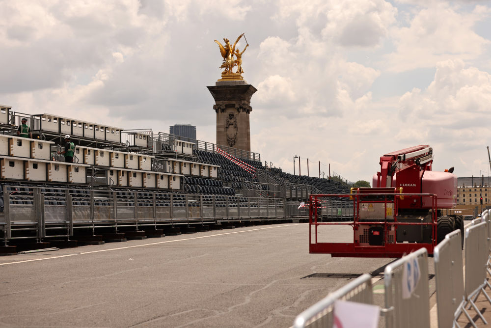 在横跨塞纳河的亚历山大三世桥上,6000个观众坐席也已经安装完成,看台背后为行人和自行车预留了一条通道,桥的两端已经被栅栏围住,无法通行。奥运期间,这里将举办公路自行车、铁人三项等比赛,残奥会期间将举办残疾人铁人三项赛事。