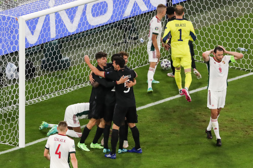 2021年6月23日,在德国慕尼黑进行的欧洲足球锦标赛F组小组赛中,德国队以2比2战平匈牙利队,以小组第二名晋级16强。图为德国队球员哈弗茨(上左一)在比赛中进球后与队友庆祝。新华社记者 单宇琦 摄