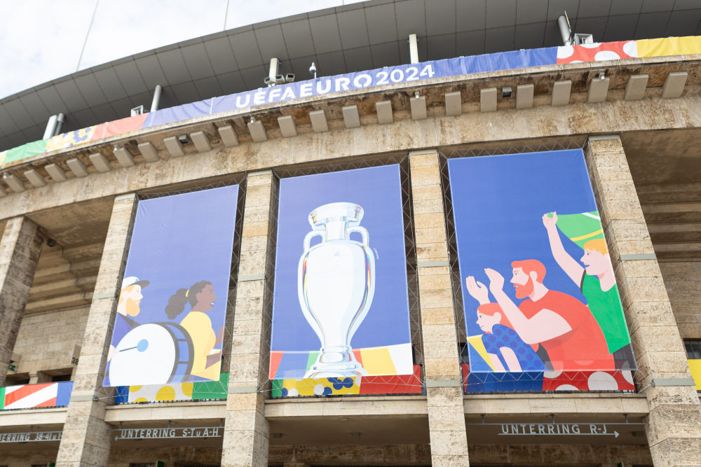 这是6月7日拍摄的柏林奥林匹克体育场外墙悬挂的2024年欧锦赛海报。新华社发(伊尼亚基·埃斯瑙拉摄)