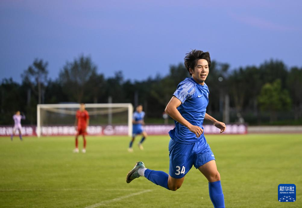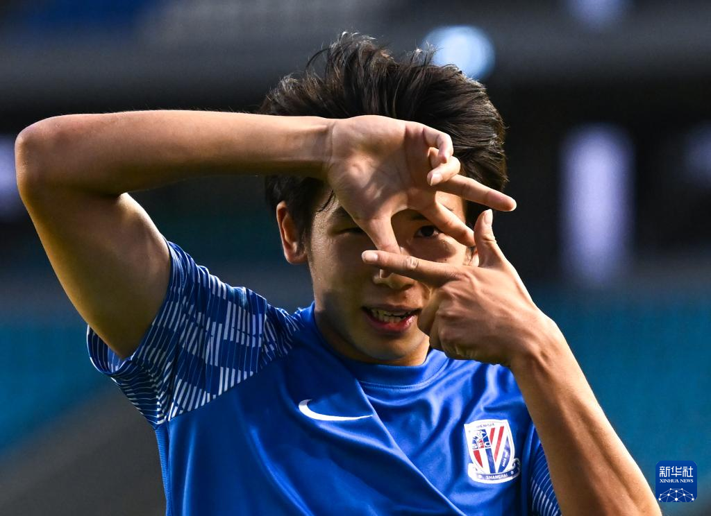 6月13日,上海申花U21队球员刘诚宇在比赛中进球后庆祝。新华社记者 贝赫 摄