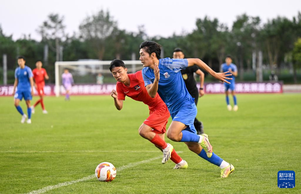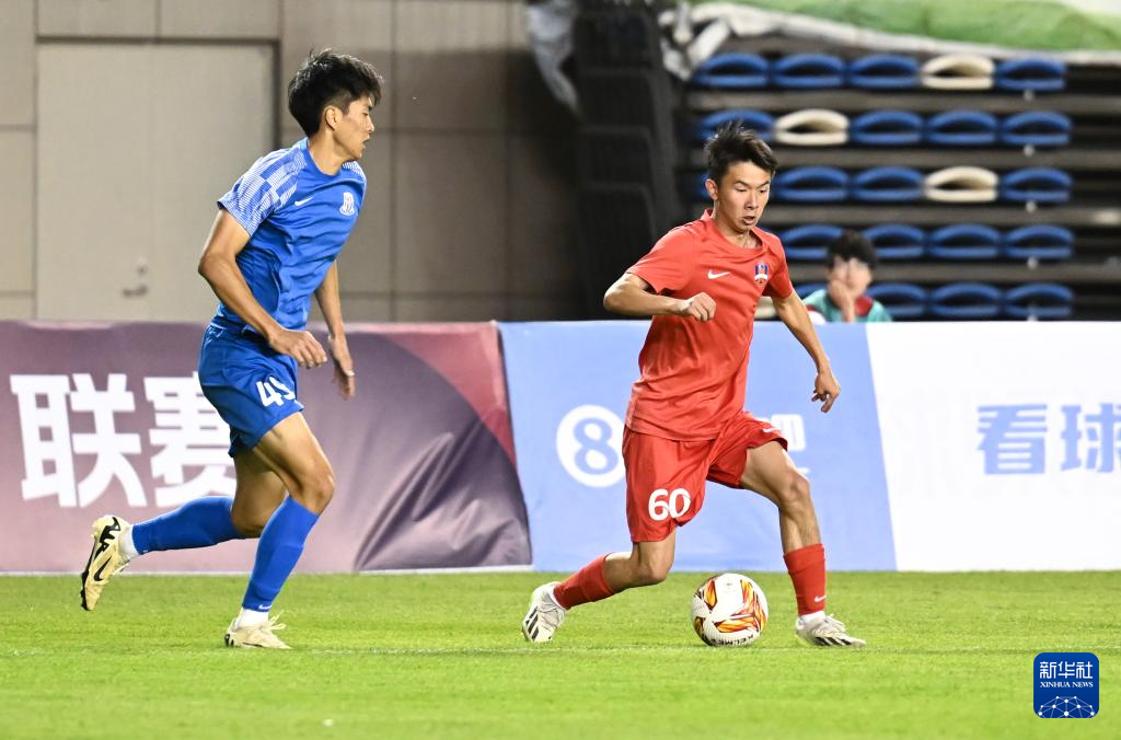 6月13日,上海申花U21队球员刘诚宇(右)与梅州客家U21队球员谯博通在比赛中拼抢。新华社记者 贝赫 摄