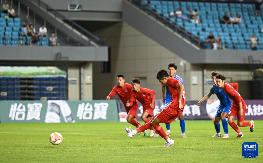 6月13日,梅州客家U21队球员张昊(前)在比赛中主罚点球得分。新华社记者 贝赫 摄