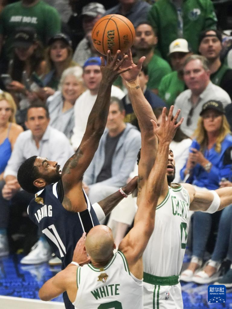 6月14日,独行侠队球员凯里·欧文(左)在比赛中投篮。新华社记者 吴晓凌 摄
