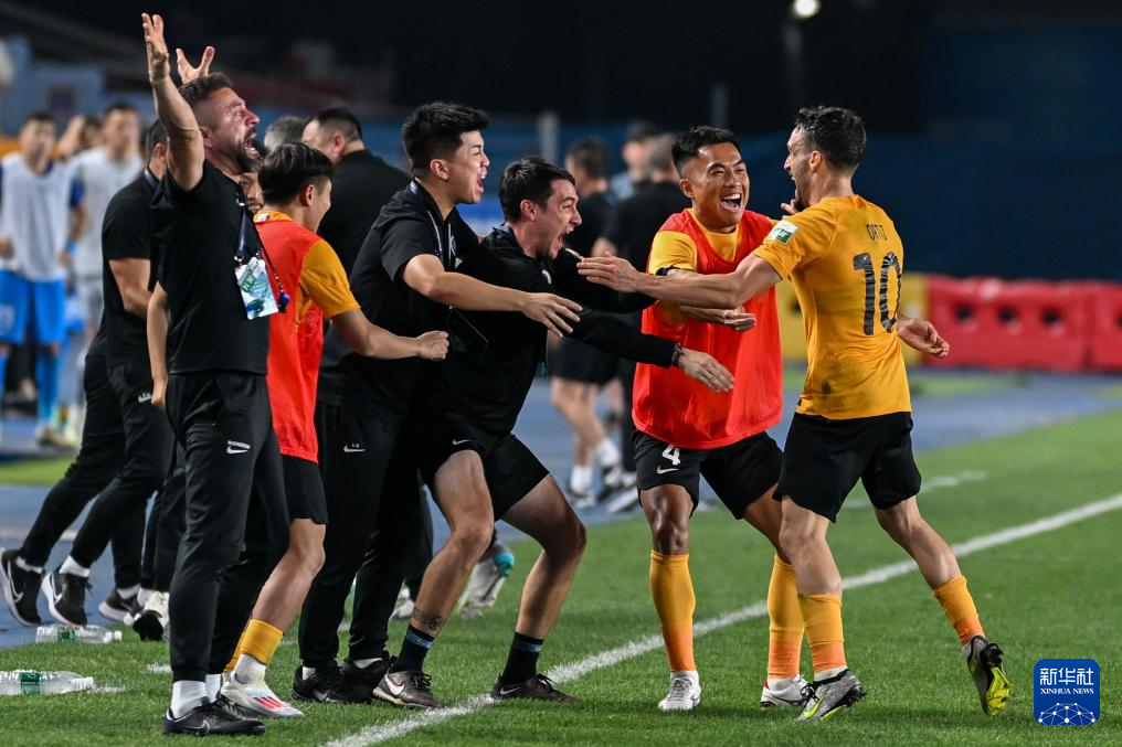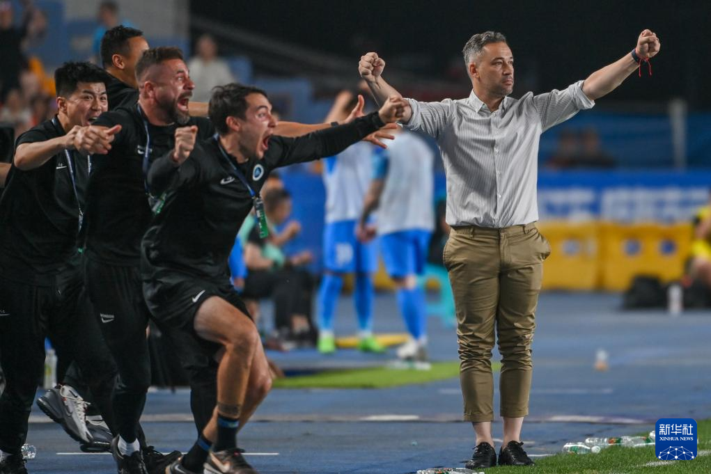 6月14日,深圳新鹏城队主教练赫苏斯·塔托(右一)在比赛中庆祝球队得分。新华社发(王须中摄)