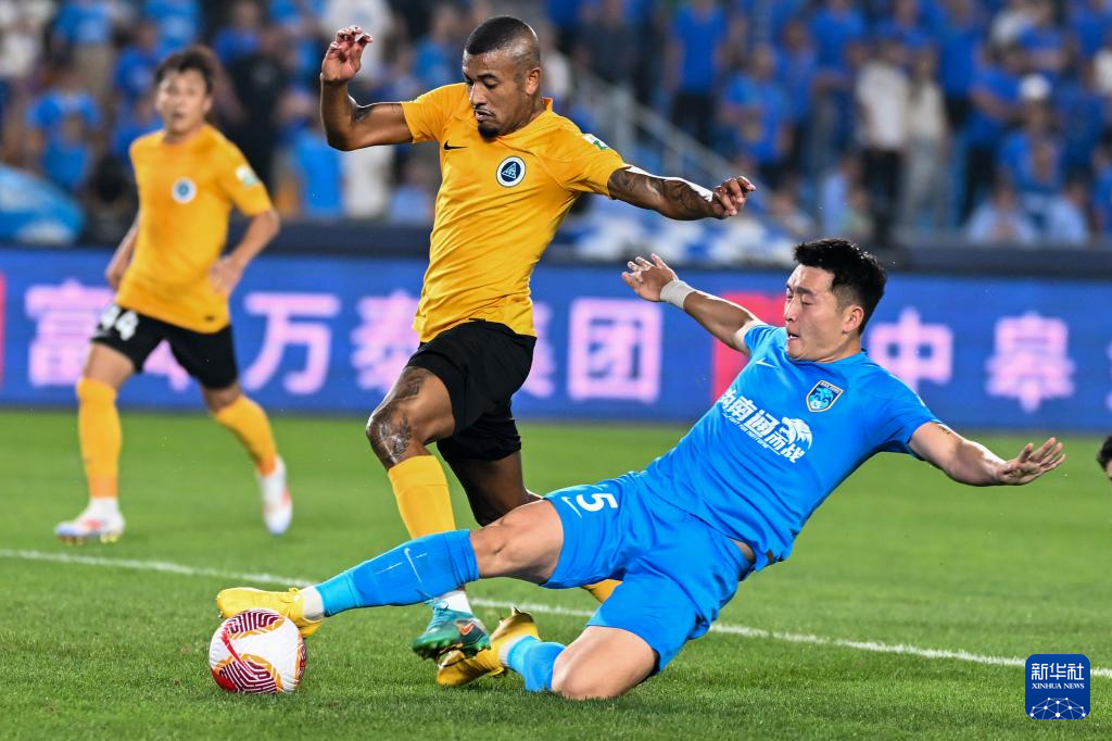 6月14日,深圳新鹏城队球员蒂亚戈(左)与南通支云队球员罗歆在比赛中拼抢。新华社发(王须中摄)