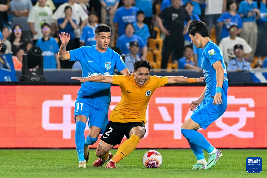 6月14日,深圳新鹏城队球员蒂亚戈(中)比赛中拼抢。新华社发(王须中摄)